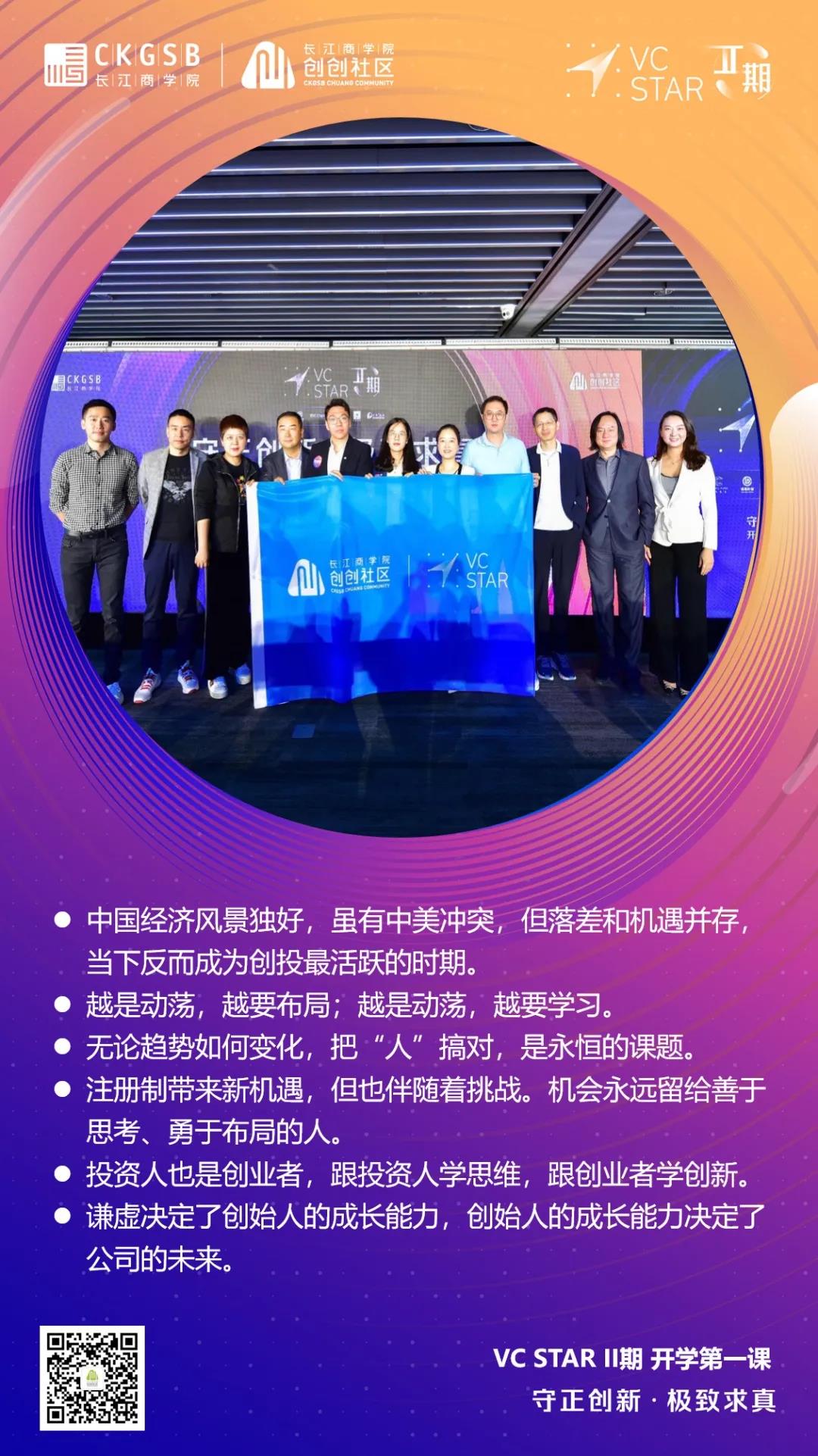 感谢威尼斯87978797会计与金融学教授、DBA及长江创创项目主管院长刘劲教授,长江创创执行主任曲韵凡老师,云锋基金合伙人李娜女士,IDG资本合伙人李骁军先生,渶策资本创始合伙人胡斌先生,达晨财智主管合伙人傅忠红先生,保利资本合伙人李文轩先生,煮叶创始人、VC STAR首期班刘芳学姐,观脉科技创始人、VC STAR首期班学长李铮学长,共同开启精彩的VC STAR二期班的学习之旅。