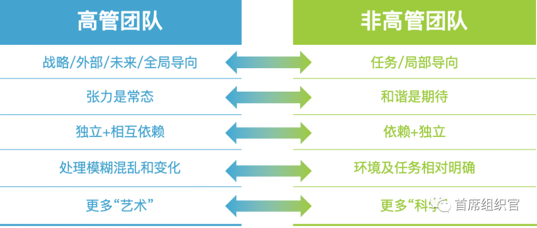 首先,高管团队相对来说是战略、外部、未来、全局导向的;非高管团队相对来说是内部、任务、结果导向。