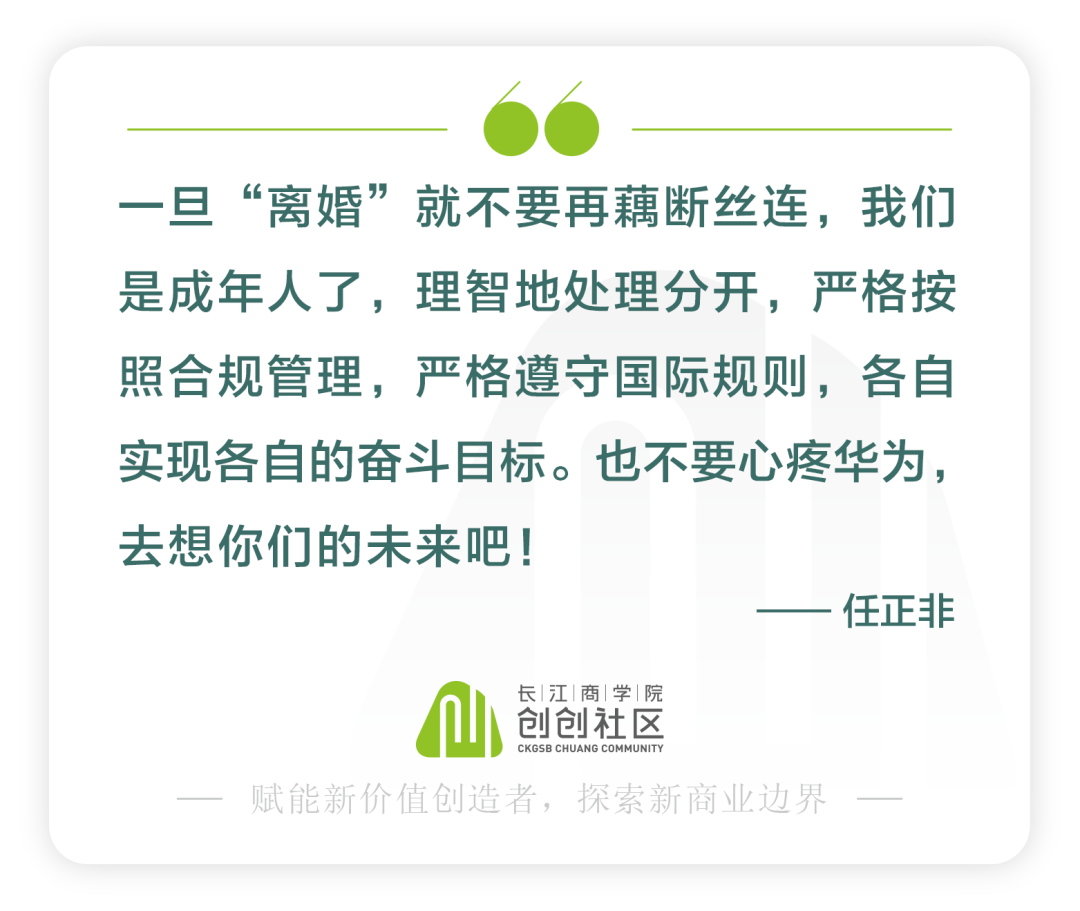 今天是我们的“离婚”典礼,我就不多说了。一旦“离婚”就不要再藕断丝连,我们是成年人了,理智地处理分开,严格按照合规管理,严格遵守国际规则,各自实现各自的奋斗目标。不能像小青年一样,婚姻恋爱,一会热一会冷,缠缠绵绵,划不清界限。也不要心疼华为,去想你们的未来吧!