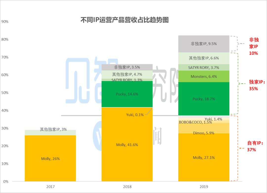 c. 而且,在这些IP矩阵当中,自有IP和独家IP对营收贡献巨大,尤其是自有IP中的Molly系列与独家IP中的Pucky系列。