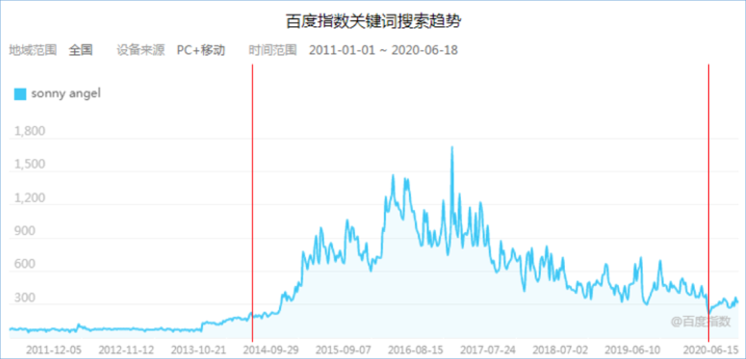 从百度指数来看,有着15年“高龄”的Sonny Angel进入我国公众视线成为爆款也仅仅是在最近五、六年。