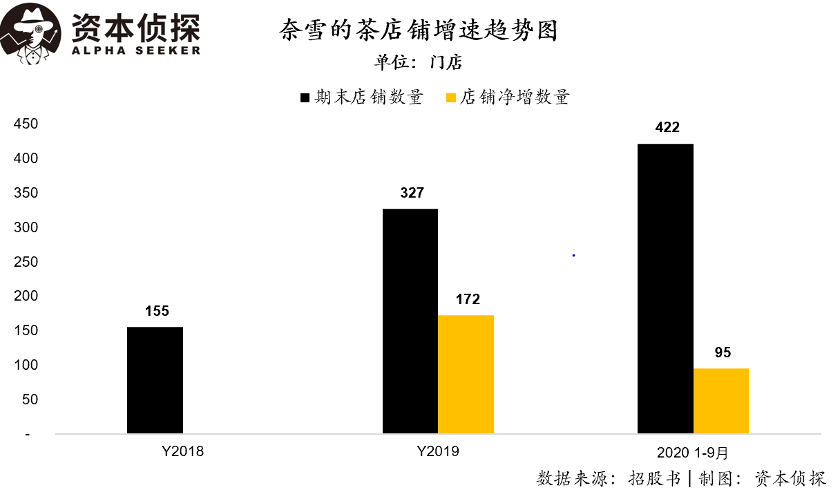 经营数据方面,奈雪的茶截止2018年、2019年及2020年9月30日门店数量分别为155、327和422家,其中2019年及2020年9月30日相比较上一报告期门店分别净增加172家和95家。