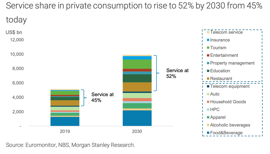 · 到2030年,对GDP的贡献,服务将超过商品(现在是45%,2030预计能达到52%)