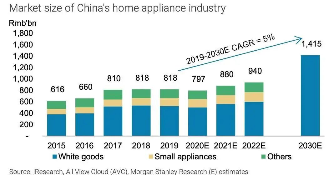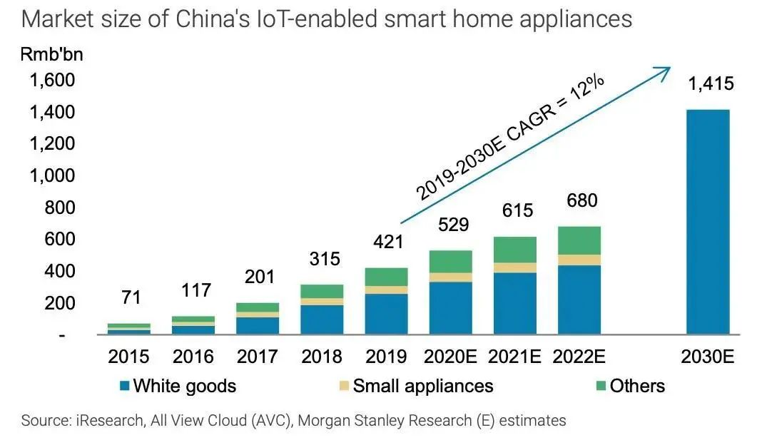 19年到2030年,家电的年均复合增长率为5%,但与此同时智能家电可以达到12%