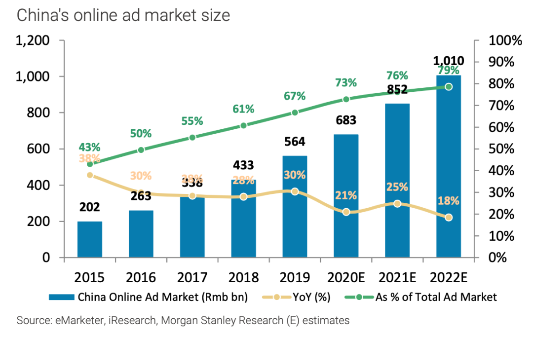 · 2019年中国的广告市场占到GDP的0.7%,对比美国是1.1%。同时中国的在线广告营销市场规模大约是美国的54%