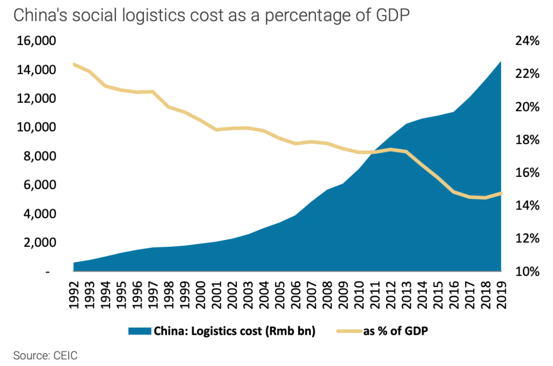 物流占GDP比重将在2030年降低到10%,这个数字在2019年是15%