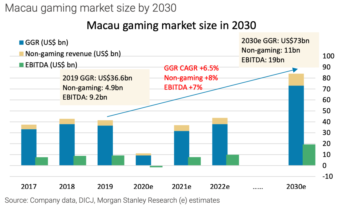 澳门博彩业的赌博/非赌博业务在2019到2030年间大约可以保持6-7%的年化增长率