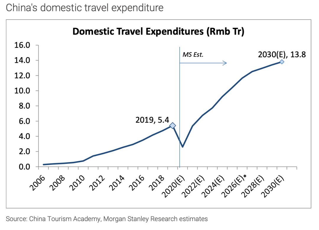 国内旅游支出预计从2019年的5.647万亿,到2030前保持9%的年化增长,到13.8万亿
