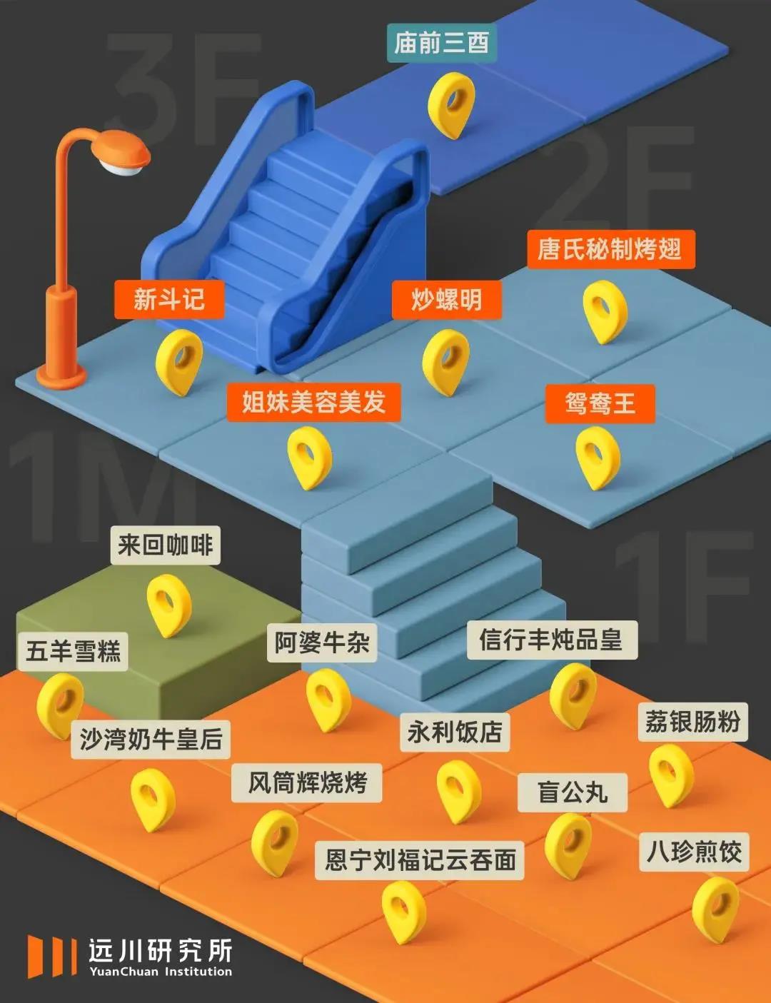 一般来说,商场的一楼租金最高,楼层越高租金越低,具体来讲是,1F>2F>3F>4F>BF(地下)>5F,因此一楼往往安排给承租水平高的零售商户,而引流量大且客户粘性强的餐饮常被安排在地下、四楼及以上,一来避免排队造成动向拥堵,二是引导客流逛商场,三是高楼层租金低,餐饮品牌可负担。