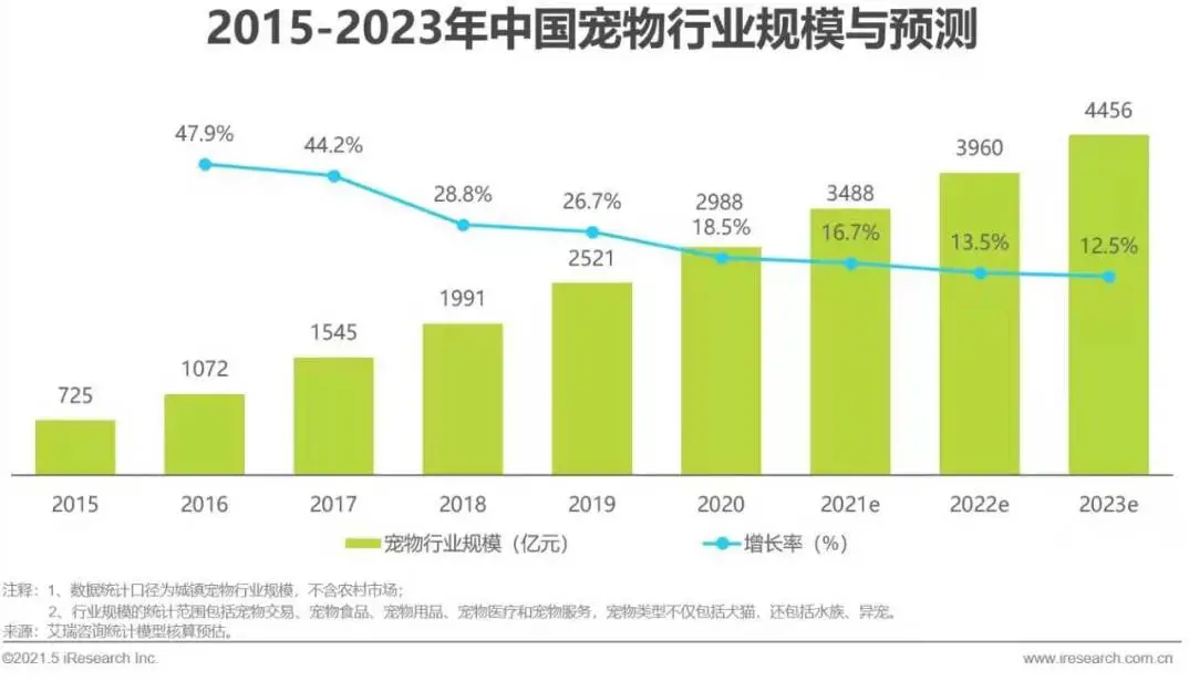 随着我国居民收入提升和养宠人群不断扩大,宠物消费相关的商品和服务类型不断丰富,国内宠物行业规模快速扩张。2020年我国城镇宠物市场规模接近三千亿元,2015-2020年6年间复合増速达到32.8%。随着宠物家庭渗透率和行业成熟度的持续提升,宠物行业依然会保持稳步增长。艾瑞预测,未来三年我国宠物行业复合增速在14.2%,到2023年规模将达到4456亿元。