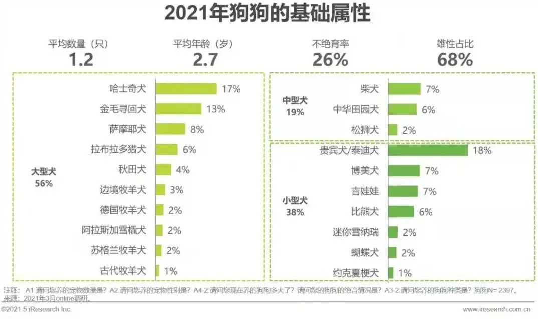 养狗家庭户均狗狗1.2只,“独生狗狗”占比88%,平均年龄2.7岁,雄性比例高,不绝育比例高达26%。