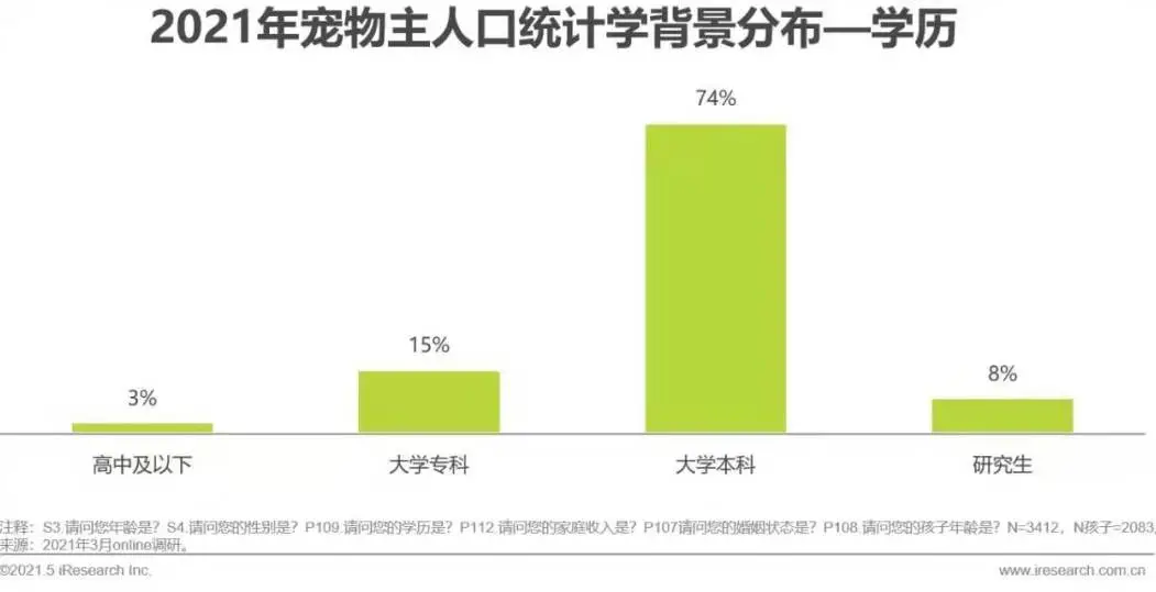 女性养宠比例更高,宠物主中本科率超过七成,家庭月收入在1.5w以上的宠物主比例达72%。