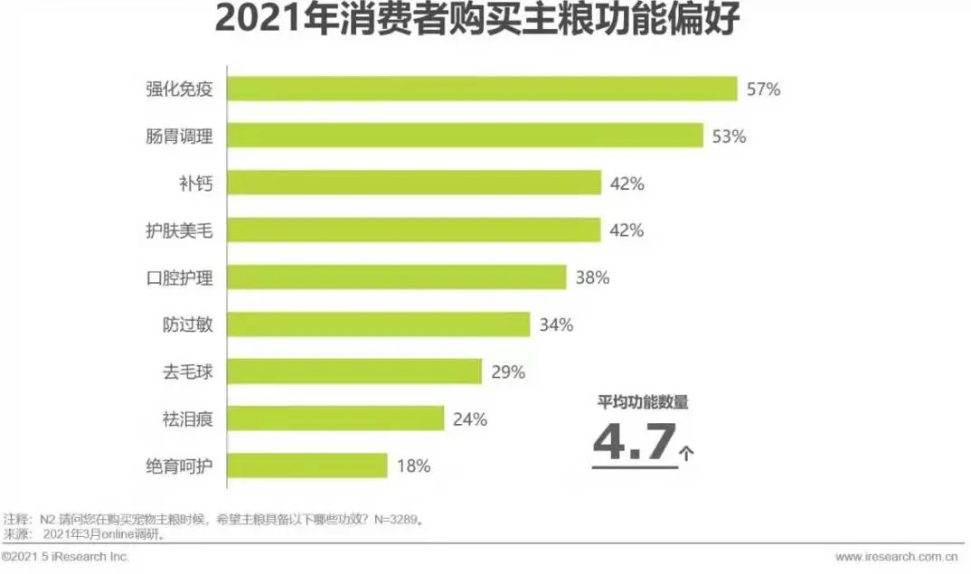 宠物主关注主粮多重功能,强化免疫、肠胃调理、补钙和护肤美毛是重点。对主粮的功能需求的多元化,表明宠物主养宠需求差异化较大,精细化养宠特征开始显现。