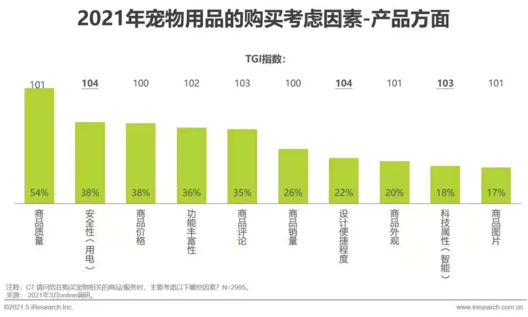 宠物用品在商品智能科技属性、商品安全性和商品设计便捷程度等方面对比总体宠物商品的消费者关注度更高。智能用品迎合了宠物主省时省力的需求。