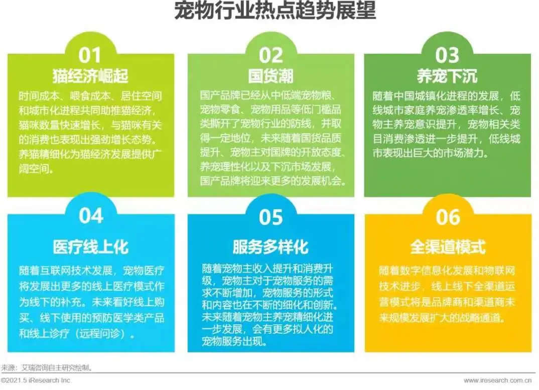 行业趋势展望:猫经济崛起,猫主消费增长态势强劲;国货品质提升和养宠理性化趋势将促进国货潮广泛化;养宠下沉将成为宠物行业增量的新机会;宠物线上医疗模式将成为线下医疗的重要补充;宠物服务需求向多样化发展;全渠道运营模式将成为商家未来发展扩大的战略通道。