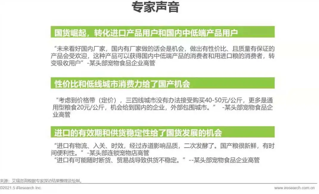 随着资本的进入和国外高质量品牌的涌入,激发了国内市场有序竞争,促进国产品牌茁壮成长。国货的高性价比、商品品质能满足宠物主需求,会获得越来越多理性养宠人的选择,国人支持国货的心理也助力了国货的崛起。此外,市场下沉趋势给国产品牌带来了更多增长空间。另外,进口品牌的有效期和供货的稳定性限制,也给了国产品牌更多的发展机会。