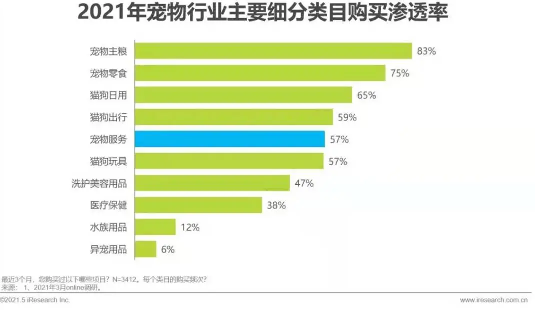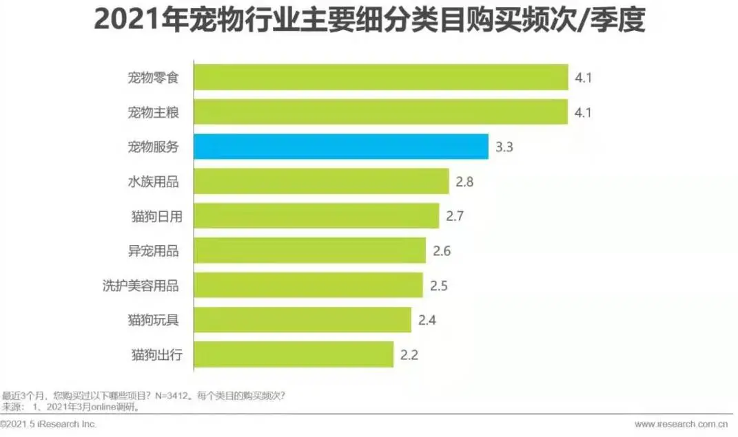 随着宠物主收入提升和消费升级,宠物主对于宠物服务的需求不断增加,从购买渗透率看,宠物服务购买渗透接近六成,从购买频次看,每季度3.3次,月均1次+,紧随刚需的食品类目之后。未来随着宠物主养宠精细化进一步发展,会有更多拟人化的宠物服务出现。