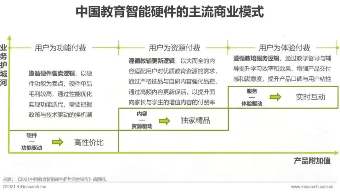 在移动互联网和物联网的商业逻辑下,教育智能硬件的盈利点逐渐从硬件本身向配套内容和增值服务延伸。1)“以硬件为基础,用户为功能付费”,通过解决某个细分的需求痛点,以短平快的操作流程和功能交付,迅速成为爆款,例如扫描笔、儿童智能手表和智能作业灯。2)“以内容为核心,用户为资源付费”,对于功能属性弱,平台属性强的教育智能硬件而言,通过深度绑定优质教育内容,夯实产品的教育价值,以提升产品的议价能力,例如点读笔、早教机和学生平板。3)“以服务为保障,用户为体验付费”,对于用户群体相对成熟的品类而言,追求教学效果的诉求终将落在深化教学服务解决方案上,基于社群的学习训练营,基于网校的名师直播课,基于AI的自适应学习,一度成为了细分品类通过核心单品破局同质化竞争与盘活存量用户的关键。
