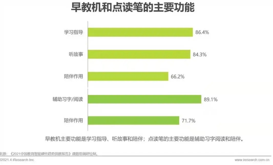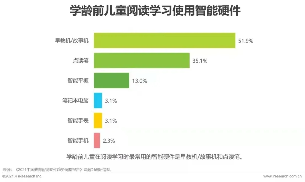 硬件品类相对集中:对于学龄前儿童来说,早教机/故事机和点读笔是使用频率最高的智能硬件,为家庭早教提供学习指导,并承担了一定陪伴作用。