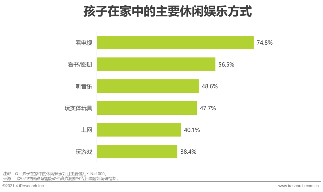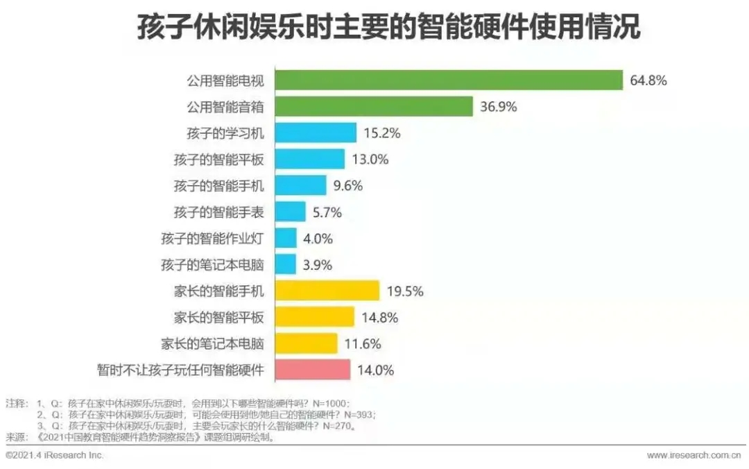 随着年级的上升和学习生活的丰富,孩子在家休闲娱乐的时间逐渐收窄,休闲时间宝贵。客厅是孩子主要休闲娱乐的场景,其中智能电视与智能音箱是孩子休闲娱乐时最常使用的智能硬件。从孩子专属智能硬件的角度来看,功能强大的学习机与智能平板中因承载了丰富多彩的益智游戏与人机交互设计,孩子可以“边玩边学”。从通用的智能硬件来看,在家长的监控下,孩子一般会通过手机/平板等产品上网进行听音乐、浏览信息、社交聊天以及玩游戏。