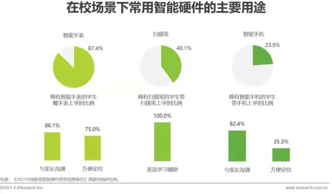 安全监控与教育辅助工具:学生带智能手表和手机入校主要是出于安全考虑,方便定位与放学后的及时联系;手机受限于缺少足够的监控功能而更少入校。