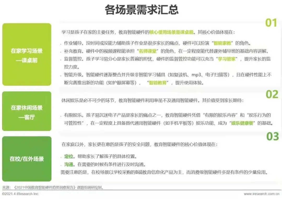 在家庭场景中,课桌是孩子的核心学习场景,客厅是孩子主要的休闲娱乐场景;在校园场景中,只有少量消费级智能硬件可入校,起到安全监控及教育辅导作用;在外出场景中,如去辅导班和外出游玩时,教育智能硬件主要起到安全监控和沟通作用。