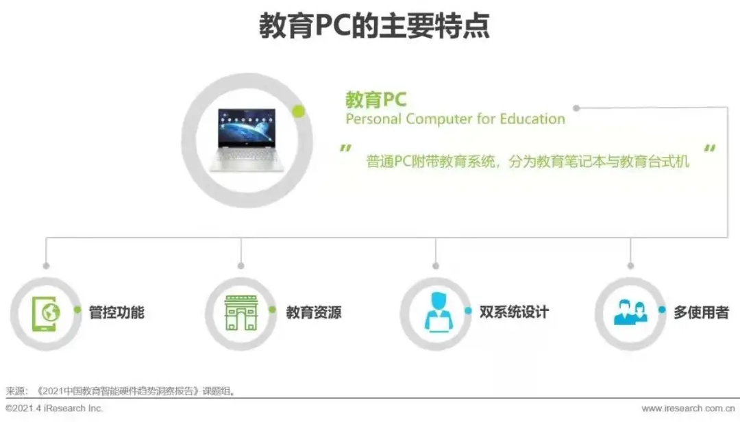 教育PC是一类专门为K12家庭设计的教育个人电脑,主要包括教育笔记本和教育台式机,在教育场景下,用户对产品便携性与书写功能的需求较多,二合一的教育笔记本逐渐成为了教育PC的主要类别。不同于学生平板对产品使用者的限制,教育PC搭载的双系统可以让用户在学习和普通模式之间切换。学习模式下,用户以学生为主,学生使用系统内置教学软件,家长可对学生的电脑使用情况进行管控。普通模式下,教育PC与一般PC并无差异,家用电脑的基本配置满足每一位家庭成员休闲、办公和学习的需求,避免了在产品性能和家庭支出上的浪费。
