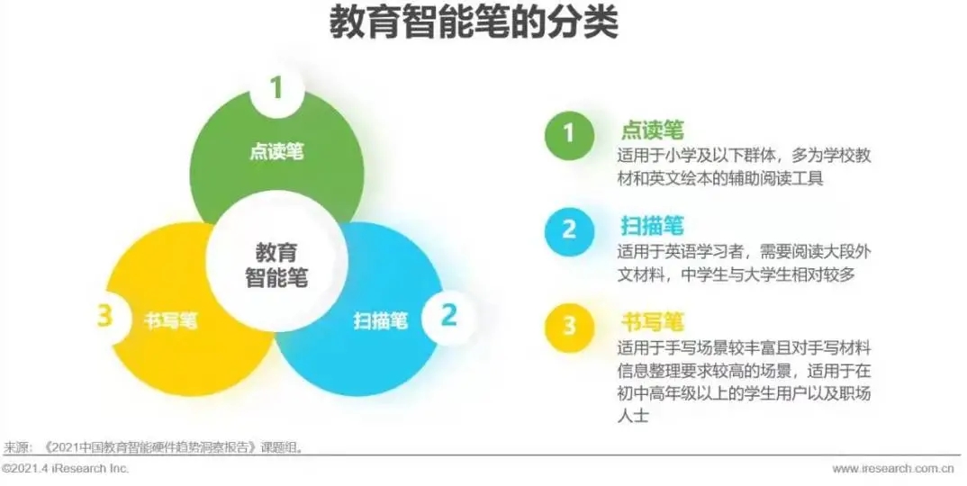 教育智能笔是一类专为学习者开发的具备笔形态的硬件终端产品,主要包括点读笔、扫描笔和书写笔,三类智能笔的适用人群、使用场景和商业模式各不相同。1)点读笔主要适用于中英文词汇量较少且仍处于语感培养阶段的学前幼儿和小学生,用户在点击配套纸质读物的特定位置时,点读笔将同步发声。2)扫描笔主要适用于小学中高年级及以上用户,因多用于英语学习,扫描笔也多定位为词典(翻译)笔,从这一角度来看,广大的英语学习者均可成为扫描笔的适用人群。3)书写笔是一种特殊的签字笔,主要依靠点阵技术实现笔记追踪与纸屏同步,多用于公立校的智慧课堂场景,消费级点阵笔多辅助于笔记整理工作,商务场合与学习场景都可覆盖。