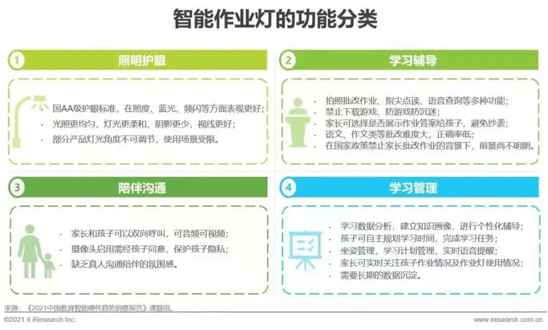 与针对学生作业场景实现自动化亮度调节的智能护眼灯不同,智能作业灯作为一种陪伴性的学习工具,在智能护眼灯的基础之上,提供了作业辅导功能。从照明的基本功能来看,智能作业灯比一般的护眼灯性能更优,在蓝光、频闪、阴影等方面表现更好;除此之外,智能作业灯的教育功能更加丰富,击中家长无法辅导孩子作业的痛点,同时提供学习辅导、陪伴沟通以及学习管理的多样功能。