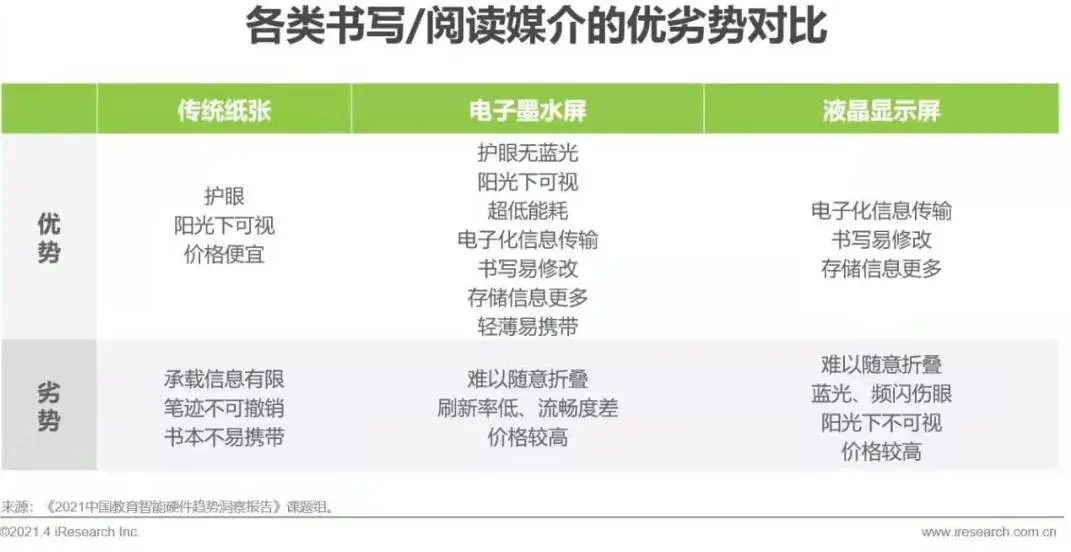 教育电子纸是一种基于电子墨水屏的“作业本”,不仅强调书写场景,还可用于阅读和练习场景。从材质来看,电子墨水屏的蓝光比例更接近传统纸张,具有传统纸张的阅读舒适感,同时,作为电子屏,又兼具电子化信息传输、书写易修改、存储空间大等特点,适配教育领域高频的阅读与书写需求。按照需求满足程度,可将教育电子纸划分为三类。首先,聚焦于教育领域,教育电子纸应当满足学生书写、阅读以及练习的深度需求,在配置上就表现为“墨水屏+笔+教育资源”三者缺一不可,如希沃小墨和海尔leadpie等,这是教育电子纸的核心产品;其次,作为传统纸张的迭代产品,满足“写作业”场景下的书写和阅读需求,“墨水屏+笔”的配置可看作教育电子纸的第二圈层,如文石BOOXNote、掌阅Smart系列等;最后,教育类产品的特点还体现在教育资源上,“墨水屏+教育资源”的配置可看作教育电子纸的最外圈层,如Kindle和各阅读器的学生版往往也预装了教育资源。