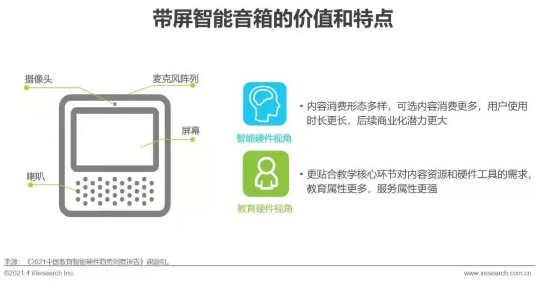 相较于普通智能音箱,带屏智能音箱在原有智能音箱功能的基础上,拓展了视频通话、在线观看视频、安全监控、拍照等功能,带屏音箱的特点在于屏幕和摄像头所带来的新的交互体验。从智能硬件的角度来看,内容可视化不仅丰富了教育资源的供给数量,还极大地优化了教育资源的消费体验,有助于提升用户的使用时长,强化智能硬件向教育场景的渗透力度,后续商业化的潜力更大。从教育硬件的角度来看,普通智能音箱通过为用户构建泛听环境,较少占用用户的注意力,用户可同时处理其他事务,因此多适用于完成相对较轻的学习任务(知识问答与检索、播放教育音频等),而对于带屏智能音箱而言,丰富的内容呈现形式携带了更多的信息量,需要占据用户更多的注意力,用户可以完成相对系统地学习任务(游戏化课程、直播课、在线测评与练习等),更贴合核心教育环节对硬件的需求。