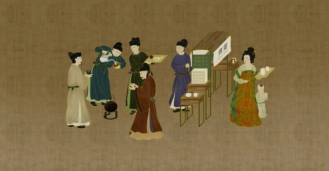 所以我们“恶搞”了一下,找了五幅跟中国茶特别有关系的名画,其实是唐宋明时期的一些名家画的。比如撵茶图、宫乐图,但我们悄悄地改了一下,就是让这些宫女们手上拿的茶杯是煮叶的茶杯、坐的桌子是煮叶的桌子,饮茶环境是在煮叶里。这样你既能看到过去,又能想到现在。