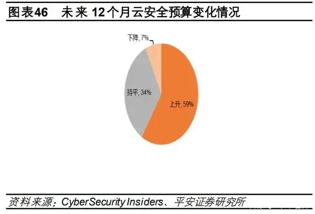 云安全将成为新的增长方向。云安全是伴随着云计算的快速发展而成长起来,并保持着积极发展势头。随着政企业务和个人应用上云的加速,云计算平台的脆弱性开始显现,基于云计算或者针对云计算平台的攻击也开始增多,市场上对云安全的关注度持续提升,并快速转化成 IT 投入,客观上拉动了云安全市场的快速发展。2019 年网络安全交付模式中,通过云进行的安全交付占到 12%;在一些关键安全市场上,包括安全邮件、网关等,采用云上交付的占到 50%。调查企业安全预算中有 27% 在投向云安全,59% 的企业未来 12 个月内会增加云安全预算。