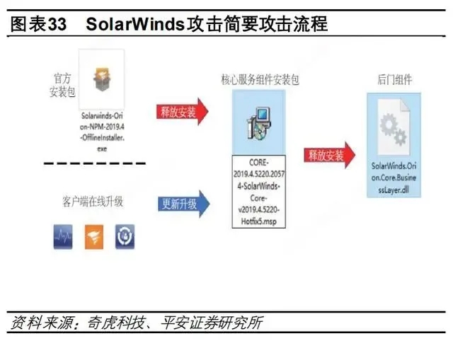 1)供应链攻击增多,系统防御正面显著增大。2020 年岁末,全球最严重的一连串攻击事件浮出水面。该系列攻击事件发酵于 2020 年 12 月中旬,知名 IT 公司 SolarWinds 旗下的 Orion 网络监控软件更新服务器,被发现遭黑客入侵并植入恶意代码,美国财政部、商务部等多个政府机构用户遭到入侵和监视,此外多家商业公司如微软、英特尔、思科、VMware 等也都遭受到了入侵。这次攻击属于 APT 攻击中的供应链攻击,利用用户 IT 供应链上某一个环节进行的网络攻击。