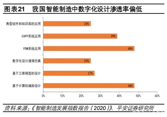 智能制造、正版化和国产化催化,国产 CAX 软件迎来发展机遇。目前我国数字化设计渗透率偏低,随着我国工业数智化转型的深入推进,研发设计类工业软件发展潜力大。当前我国软件整体正版化率可能不及 50%,CAD 等研发设计类工业软件正版化率可能更低。受益国家软件正版化政策和市场条件逐步成熟的双重推动,研发设计类工业软件在企业端的采购将大幅扩容。美国科技制裁不断,研发设计软件 “卡脖子” 问题突出,国产研发设计类工业软件对国外工业软件的逐步替代将成为长期趋势。在智能制造、正版化和国产化的推动下,公司研发设计类工业软件业务迎来发展良机。具体来看: