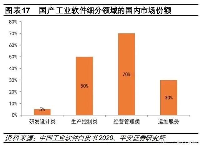 (1)我国工业软件正处起步阶段,设计软件类国产化率低