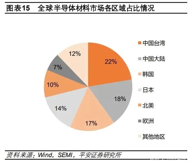 2020 年中国大陆半导体材料市场增速全球第一。从区域来看,2020 年,中国大陆、中国台湾、韩国、日本、北美是全球前五大半导体材料市场,合计占比达到 81%。2020 年,中国大陆市场规模快速增长至 97.6 亿美元,成为全球半导体材料第二大市场,市场规模增速 12%,跃居全球第一。