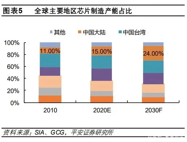 在芯片制造方面,短期内产能确实存在不足的问题,自主高端产能不足的问题更为严重。中国在该领域未来十年的新增产能规模庞大,中长期这个问题将逐步得到缓解。预测到 2030 年中国大陆芯片制造产能占全球比重有望超过中国台湾省,居全球首位。2020 - 2030 年间新增产能占全球的比重可能在 32% - 40%之间,产能受限的问题将得到破解。