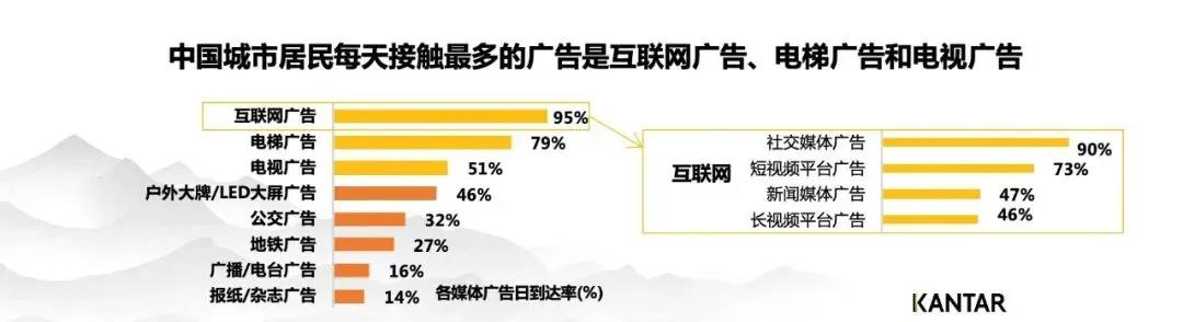 第一是互联网广告95%,第二是电梯广告79%,第三是电视广告51%。