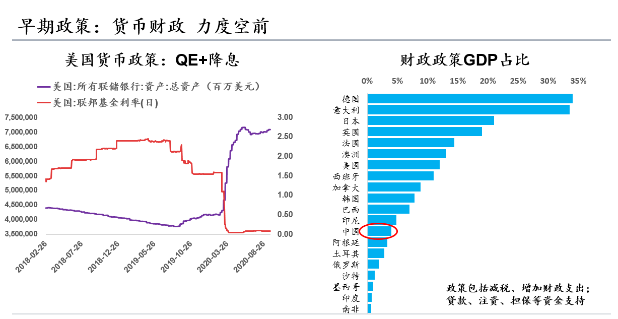 那疫情是一个让这个趋势加速到来的催化剂,对全球经济产生前所未有的冲击。经济下滑之后,海外多国政府出台财政政策,又是没有节制地来支持经济,这里边可以看到不同的国家拿出20%-30%GDP的量来支持市场(减税、给个人、企业发钱),这是影响全球资本市场未来一段时间内最大的一个因素。这一轮危机中,中国政府虽然也有很强的支持,但是非常有节制的,我们的财政赤字率才3%多。所以这是影响经济另外一个非常重要的因素,就是政府对经济的支持力度是前所未有的。
