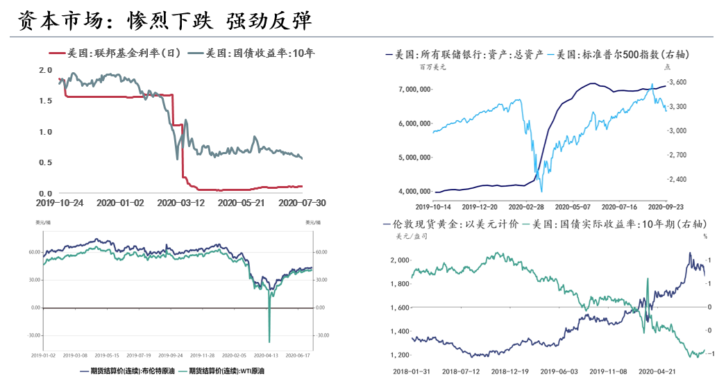 资本市场,在疫情发展过程中,它给资本市场带来了巨大冲击,并且是前所未有的。左上角代表的是美国债券市场,右上角是股市,左下角是原油市场,右下角是黄金。可以看到。债券市场,美国国债和中国国债在4月底之前是债券的牛市,利率一直在往下走,因为疫情的冲击,美联储要降息,支持经济的发展,红线是一直往下走的。