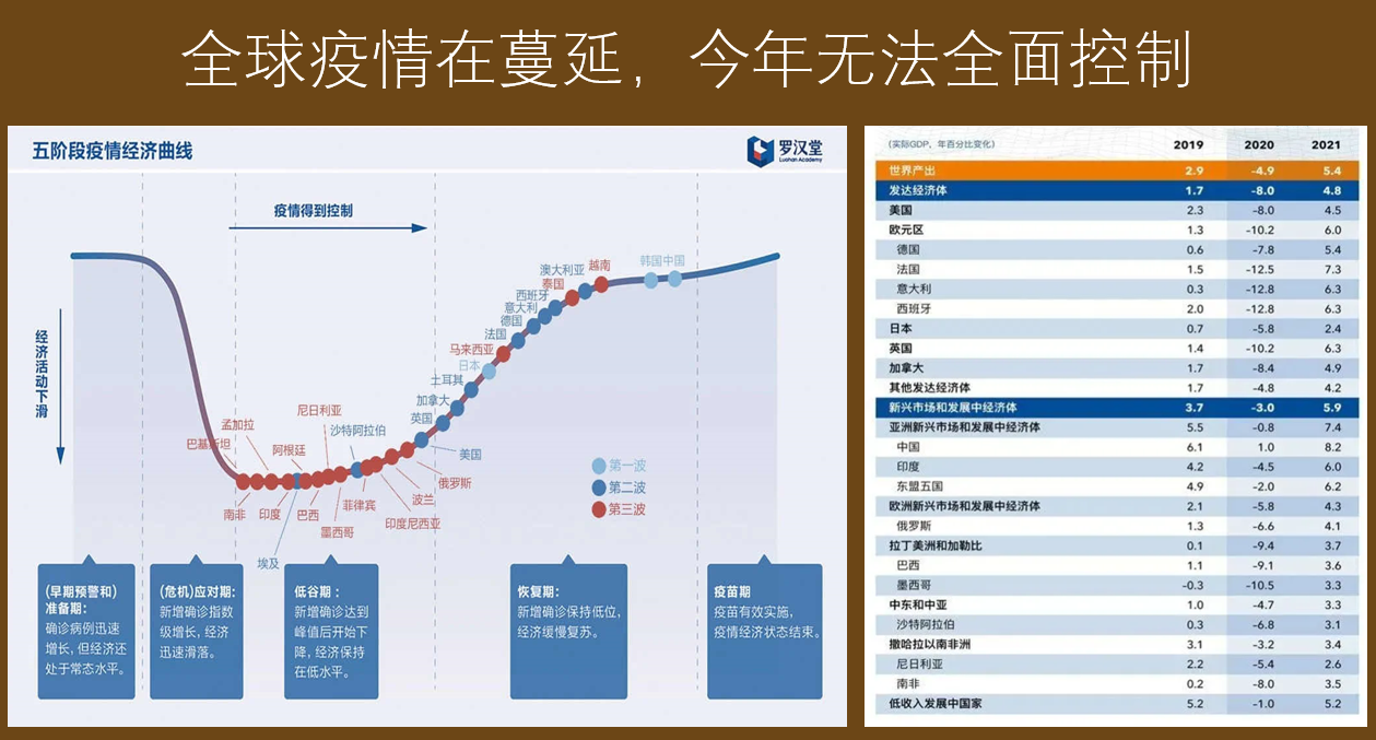 所以我们未来会面对什么样的社会?右边这个图是OECD对全球经济未来增长的预测,基本就是以2019年第四季度为出发点,假如按照以前预计的经济增长速度走(绿线),但因为经济的冲击,我们的经济增速有巨大的下滑,然后现在开始反弹。他们做了一些预测,有两种情况。