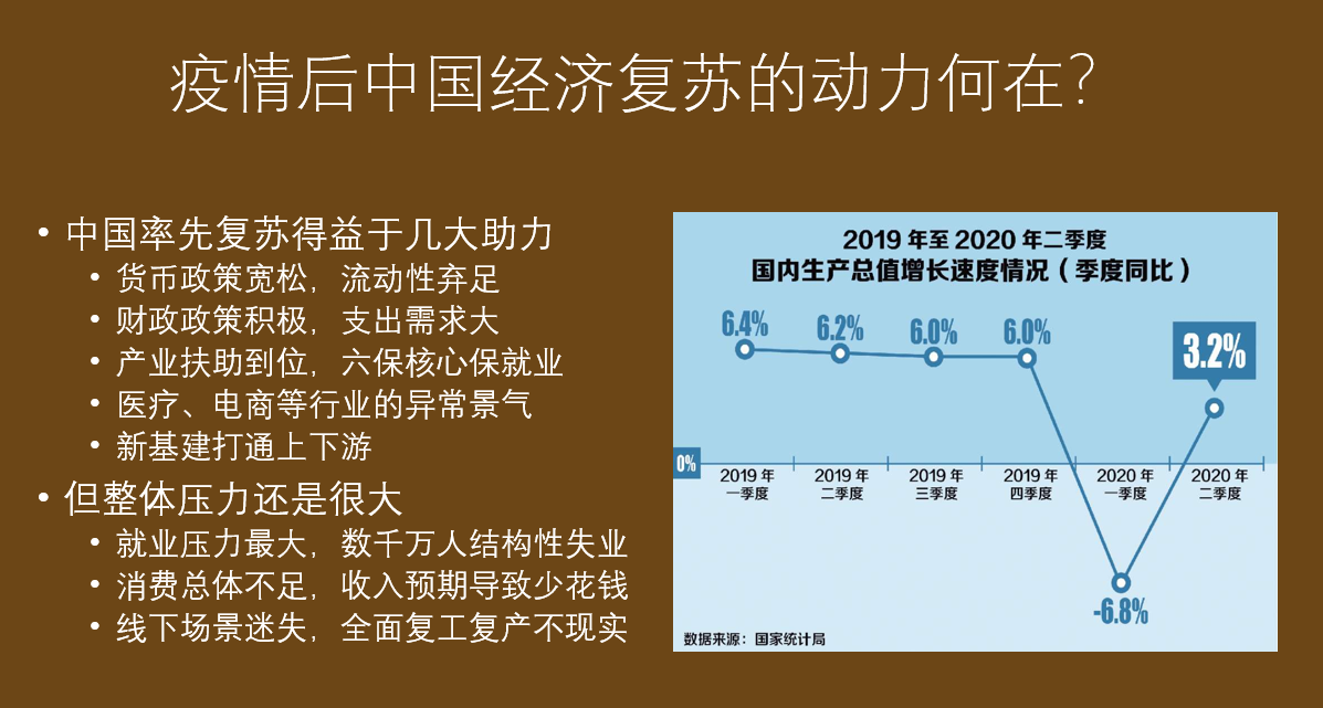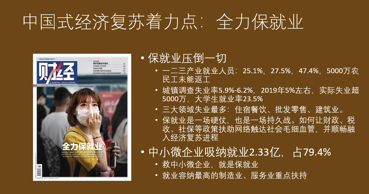 第一点:政府需要要支持民营经济,让他继续发展、容纳更多就业,保证消费、社会稳定、中国经济的发展。所以保就业压倒一切,这是我们理解这一轮中国刺激内需,国内大循环首先是就业的循环,只要就业能循环起来,消费就能循环,内需就能循环,所谓国内大循环就是非常真实的。中国经济早就实现了结构性转变,国有企业占比是30%,70%以上的经济来自于民营经济,特别是大量活跃的中小微企业。这个让我们看到中国经济复苏要全力保就业的原因。