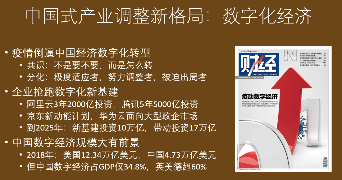 第二点:产业数字化改革,中国这一轮的结构调整我想大家已经感受到了,无论此前你是不是数字化的,你必须要尽快实现在线化、数字化、智能化,尽可能做到流程和结构的优化。