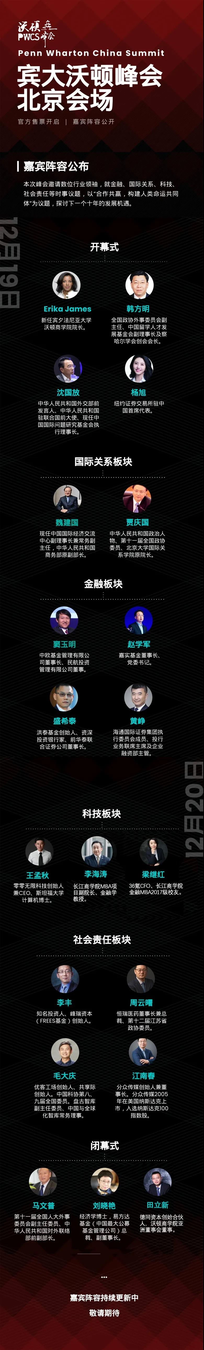此外,沃顿峰会邀请到演讲嘉宾还包括:Erika James-新任宾大沃顿商学院院长;韩方明-中国留学人才发展基金会理事长;沈国放-前中国驻联合国大使、现任中国国际问题研究基金会执行理事长;魏建国-中国国际交流中心副理事长兼常务副主任、曾任商务部副部长;赵学军-嘉实基金会董事长;盛希泰-宏泰基金创始人、资深投资银行家;王孟秋-零零无限科技创始人兼CEO、斯坦福大学计算机博士;李丰-峰瑞资本创始人、知名投资人;毛大庆-优客工厂创始人;江南春-分众传媒创始人兼董事长等。