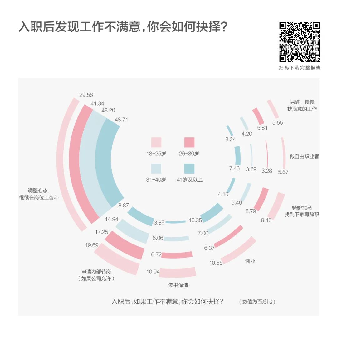他们同其他年龄段一样,优先选择是“调整心态,继续在岗位上奋斗”,其次是“申请内部转岗”“ 读书深造”“ 创业”或者“骑驴找马、找到下家再辞职”。