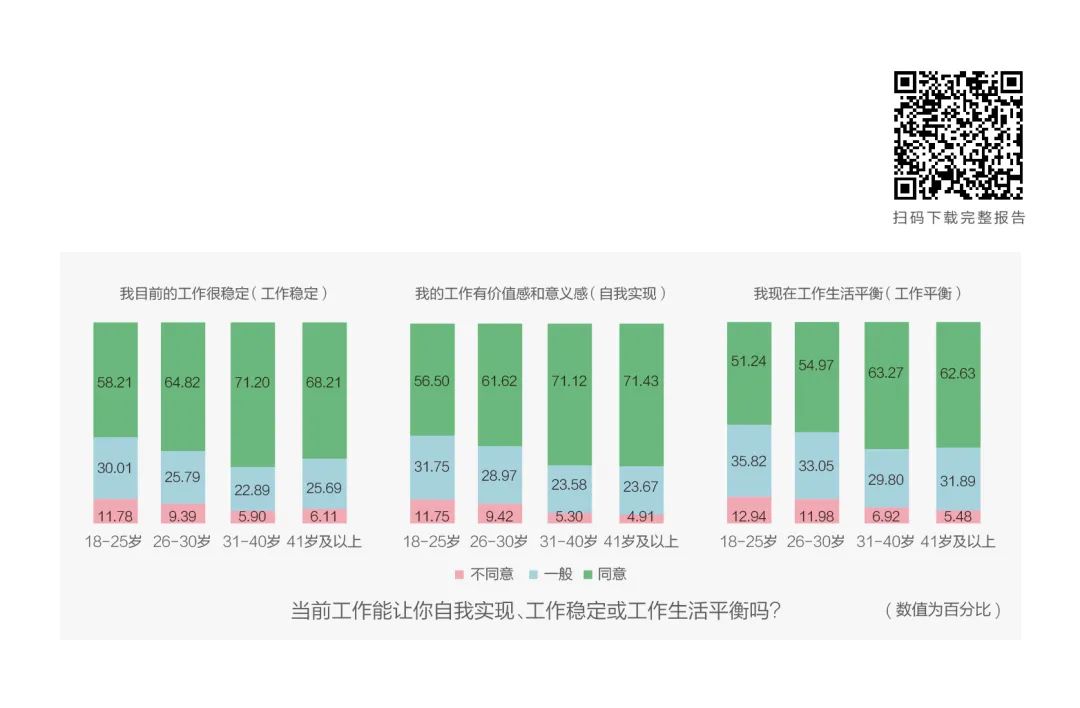 Z世代对于当前工作提供的薪酬回报、工作环境、发展前景、自我实现以及工作稳定,在各年龄段中满意人数占比最低。