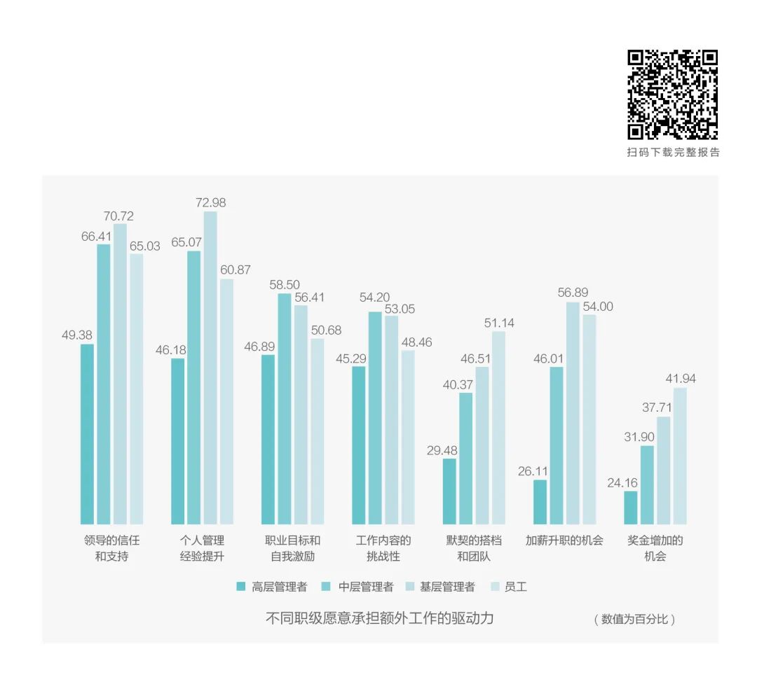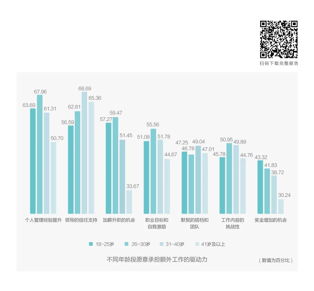 没错,我们在调研中发现,超过一半的Z世代群体认为,个人管理经验的提升(人数占比63.69%)是能够激励自己承担额外工作的驱动力因素,与加薪升职的机会(57.27%)、领导的信任和支持(56.59%)、职业目标和自我激励(51.08%)共同排名前四位。