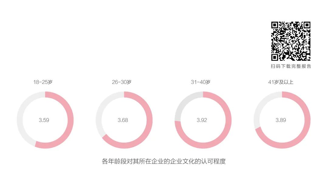 我们的调研表明:Z世代对企业文化认可度最低(为3.59分,满分5分),随着年龄的增加,认可度越高,最高的是31-40岁年龄段群体(3.92),而41岁以上群体,对企业文化的认可度又出现下降(3.89)。