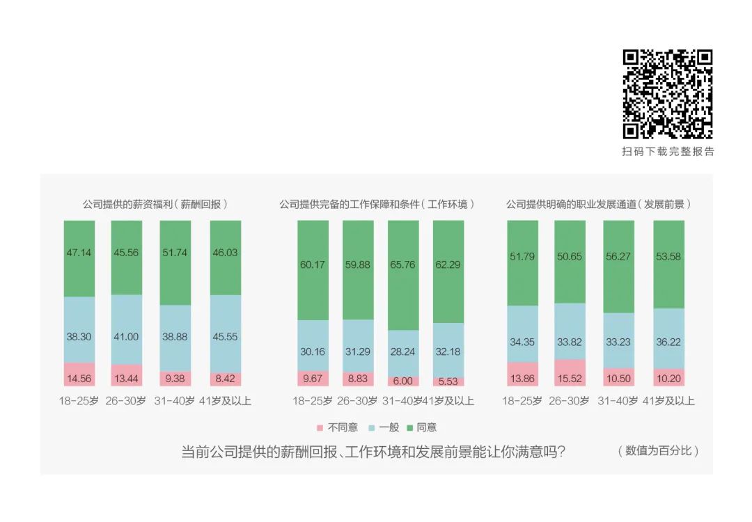 报告发现,Z世代对薪酬回报、工作环境、发展前景、自我实现以及工作稳定的满意度在各年龄段中占比最低,显示出现实与预期间较大的心理差距。